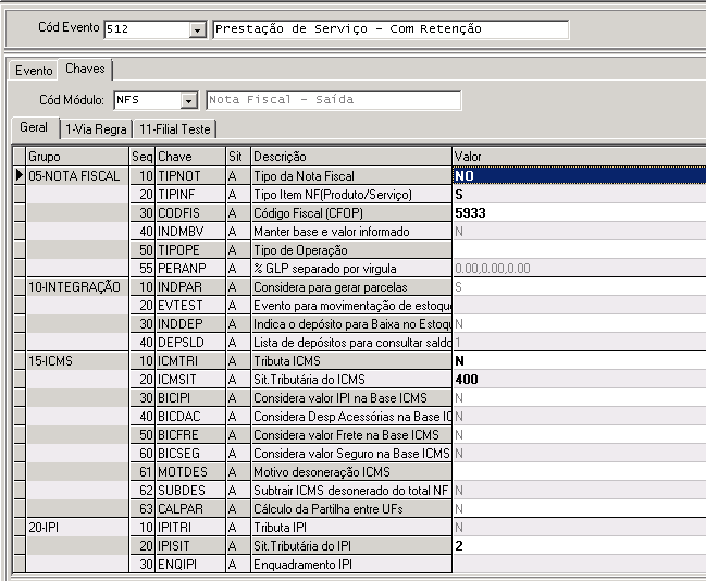 - Verifique se existe o evento com código 512. Caso não exista, faça: