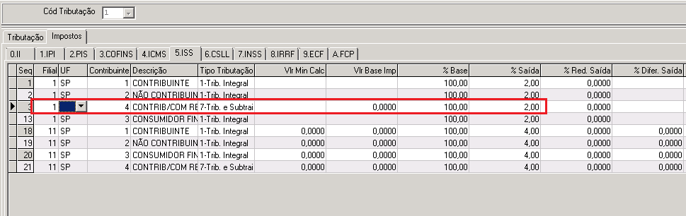 - Contribuinte: Código tributação cliente (criado no item 1) - 4 no nosso exemplo