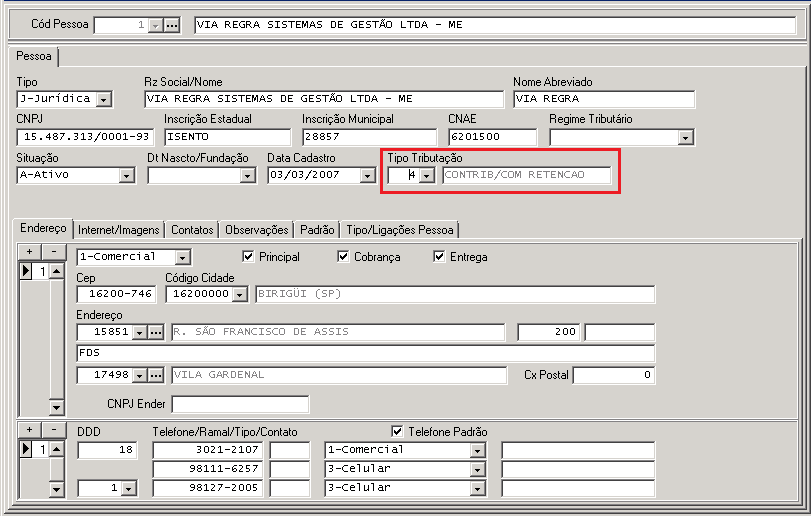 Crie um novo tipo de tributação para identificar clientes que desejam NFs com retenção.- Vá em Pessoas > Impostos > Tipo de Tributação