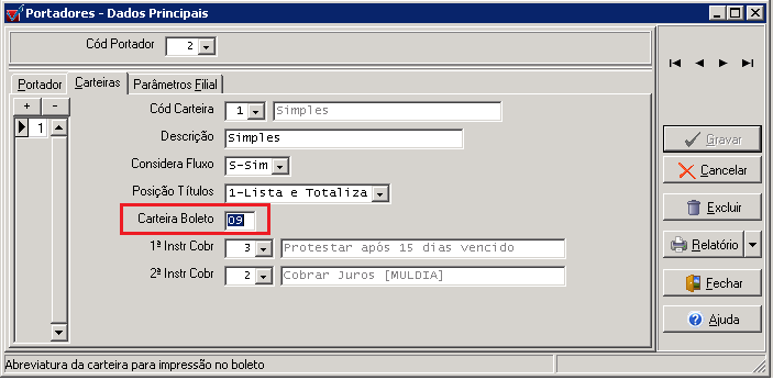 Local para informar a Carteira a ser impressa no bloqueto¶