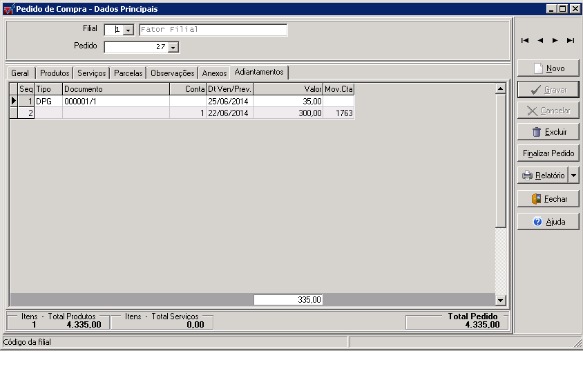 • No acerto financeiro, o valor do pedido de compra irá gerar parcelas no seu valor integral, e um título de crédito será gerado no financeiro com o valor adiantado. Esse valor poderá ser usado para debitar da(s) parcela(s) do pedido o valor anteriormente adiantado.