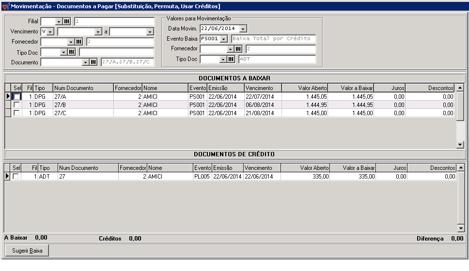 • O botão Sugerir Baixa pode ser usado para que o sistema calcule automaticamente a baixa dos títulos utilizando o crédito disponível