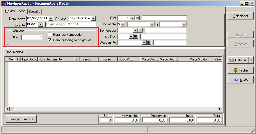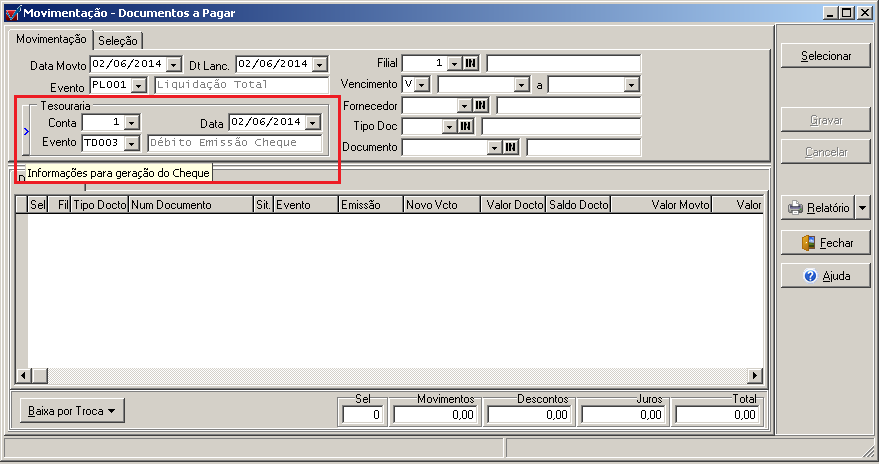 - O Evento da tesouraria utilizado deve ter o parâmetro TIPLAN = C (Tipo de lançamento CHEQUE).