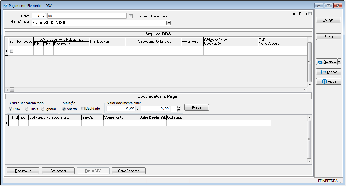 O Objetivo dessa tela é receber o arquivo de DDA disponibilizado pelo banco e verificar se tais documentos ja foram lançados no sistema e atualizar seu código de barras, com isso será possível o agendamento/pagamento do documento via Remessa de arquivo ao banco.
