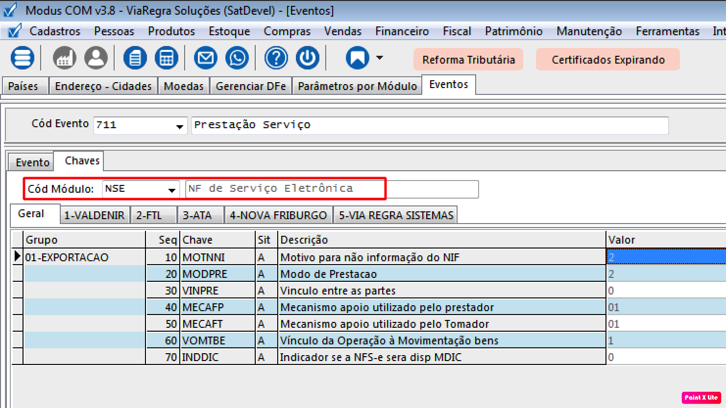 - No cadastro do Evento ative o Módulo NSE que possui alguns parâmetro necessários para NFSe Padrão Nacional. (Estes parametros ja estão preenchidos com um valor default e deve ser avaliado se ha necessidade de alteração)