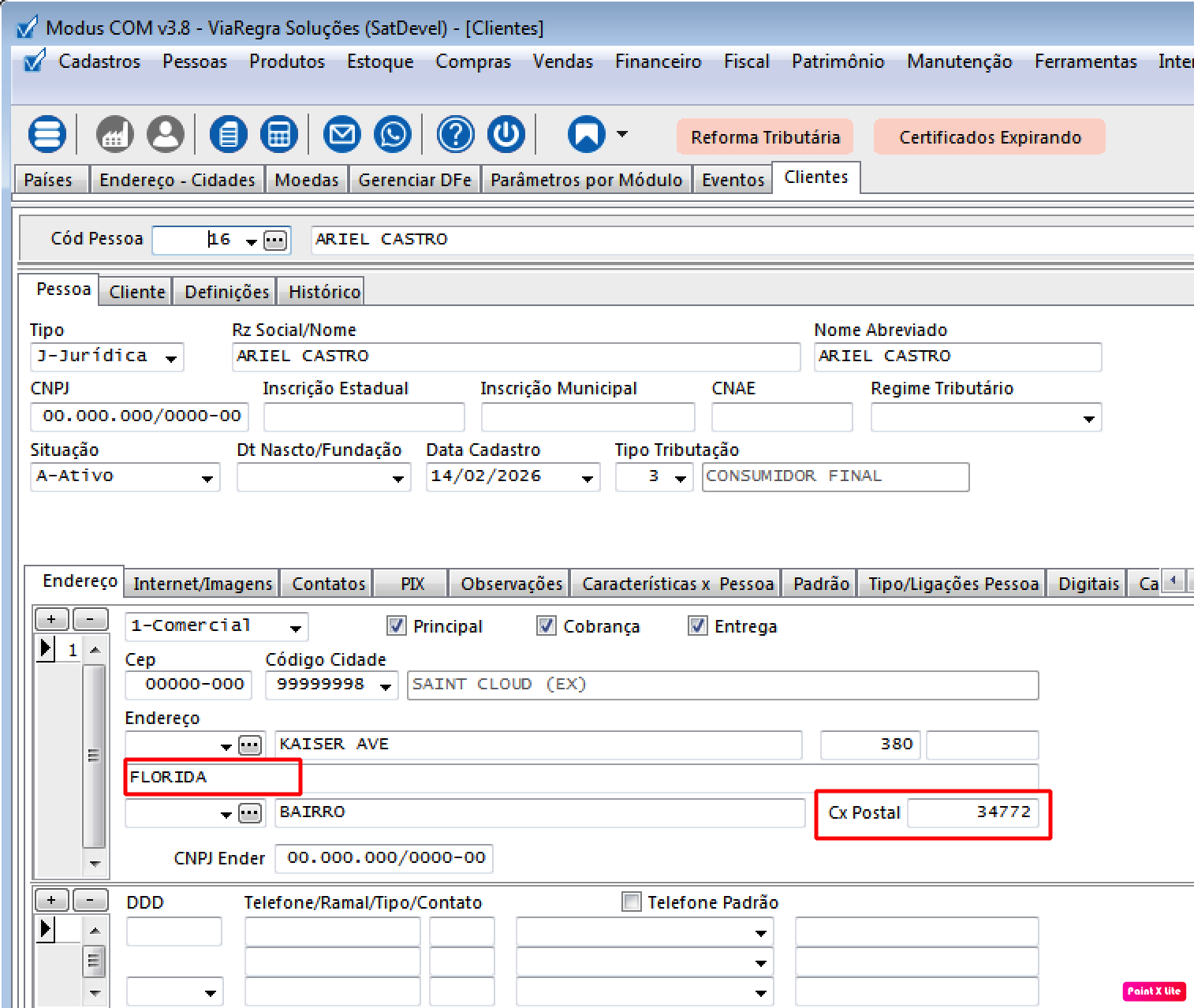 - No campo CX Postal do endereço do Cliente informe o Código de Endereçamento Postal do endereço no exterior.