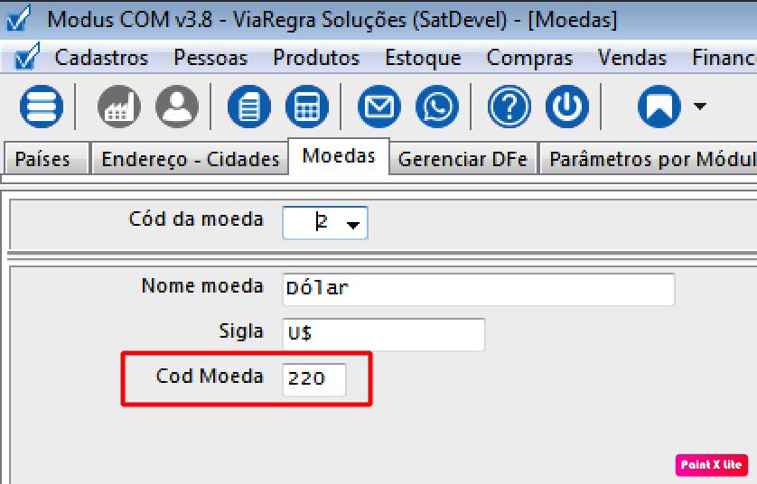 - No cadastro de Moedas no campo Cod Moeda logo abaixo da sigla, informe o codigo da moeda de acordo com a tabela de moedas do Banco Central do Brasil
