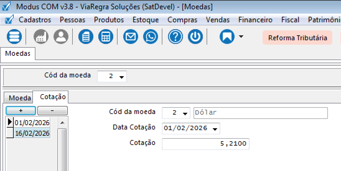 - Cadastre a cotação da moeda, o Sistema irá busca a partir da data de emissao da NF ou mais recente