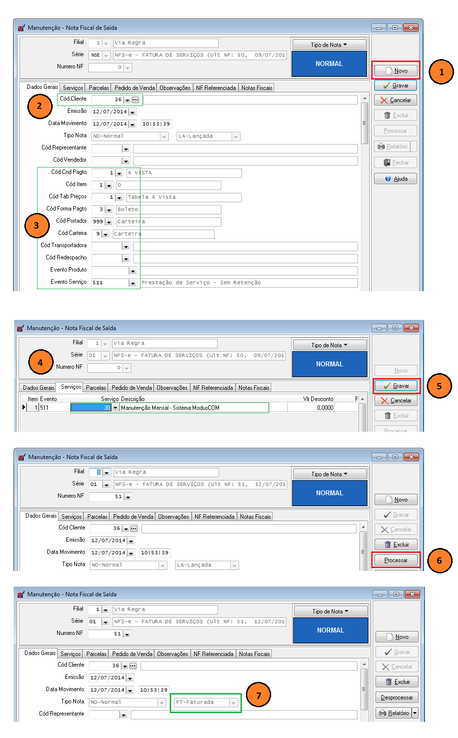 - Confirme o processamento e aguarde. No final do processo observe que a nota fiscal deve ficar em situação FT-Faturada.
